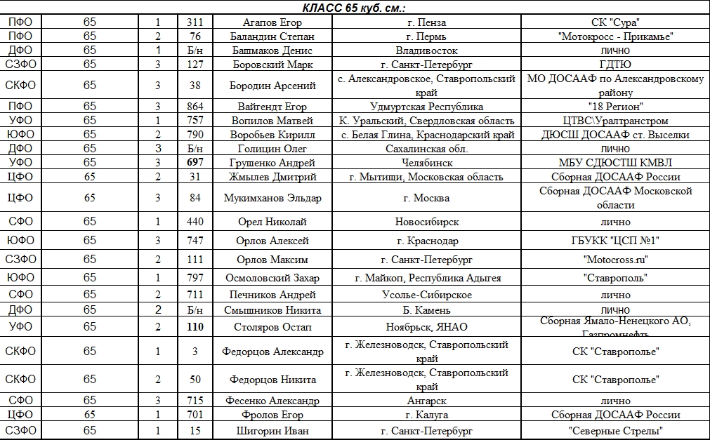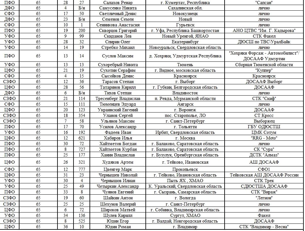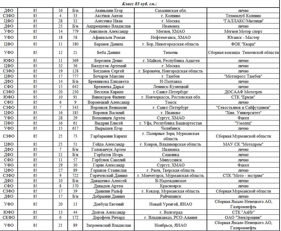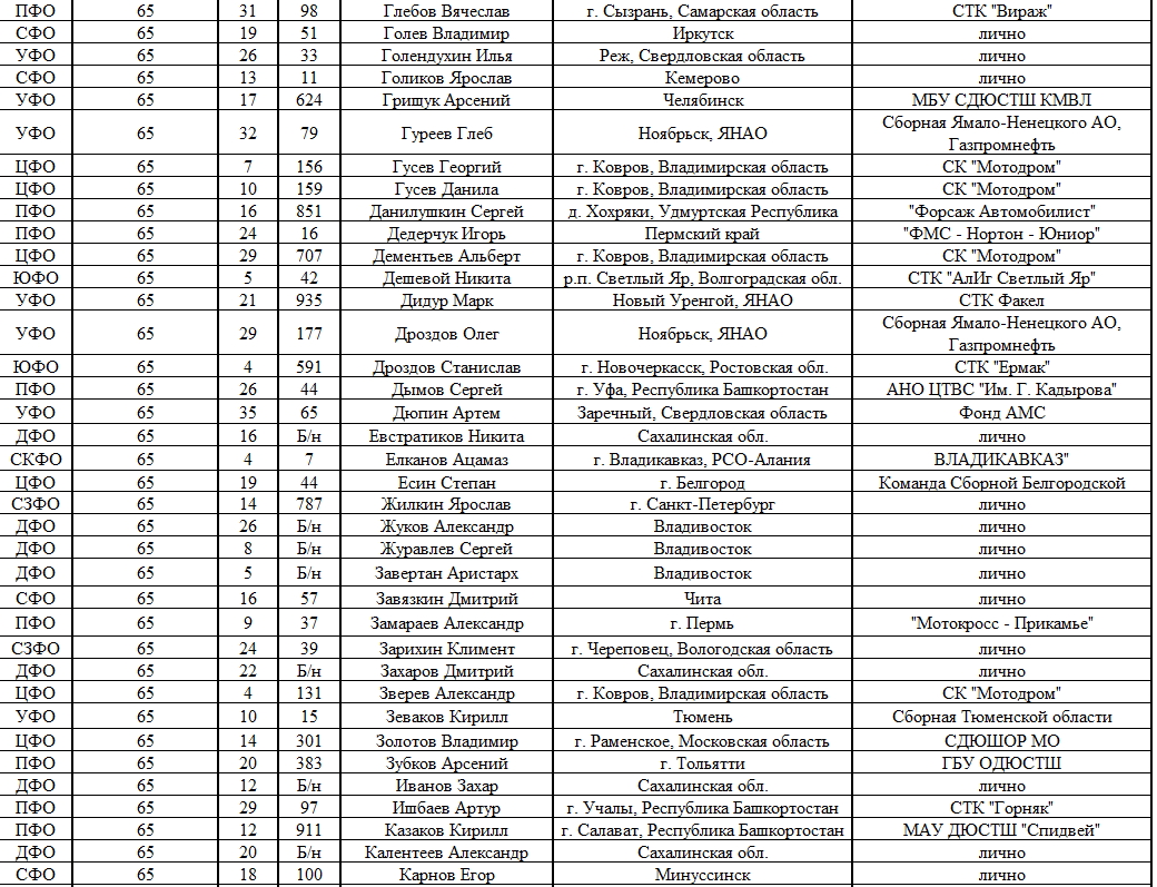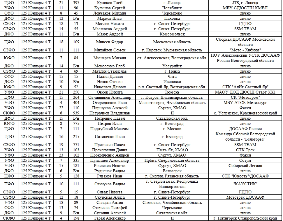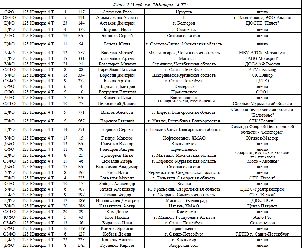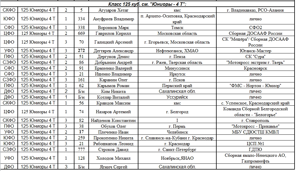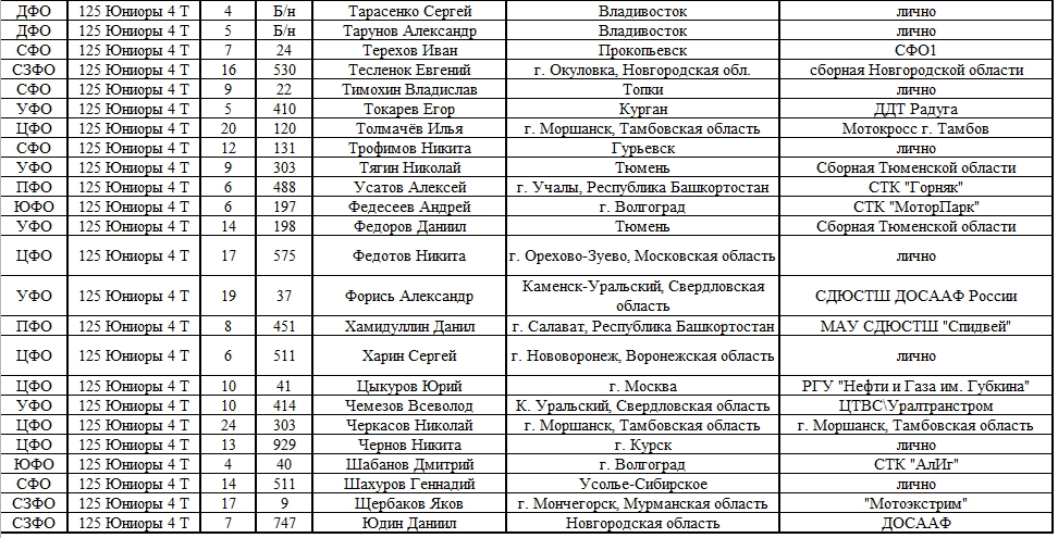Списки гонщиков допущенных к финалу Первенства России по мотокроссу 2015 19.08.2015 Роман Мишенев (_) Списки допущенных спортсменов участников Финалов Первенства России по мотокроссу 2015, который пройдет с 21по 23 августа в посёлке Сахзавод. Призёры Федеральных округов (без отбора): Участники квалификационного отбора: Комментарии Комментарии к этой статье запрещены.