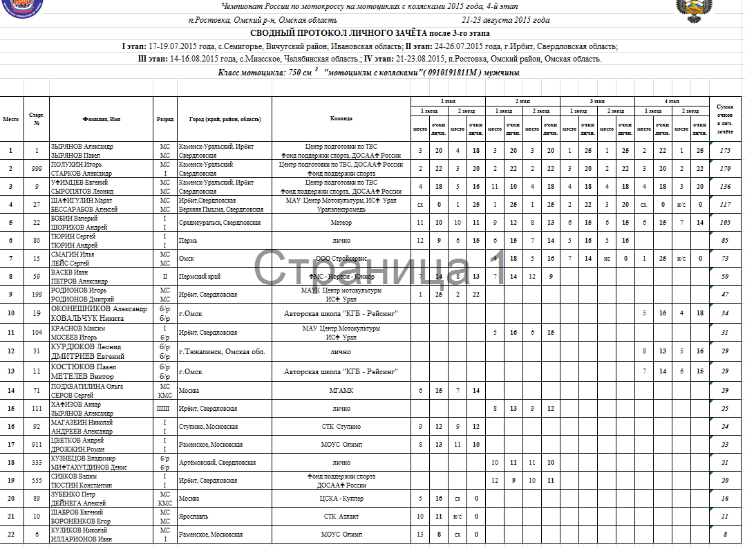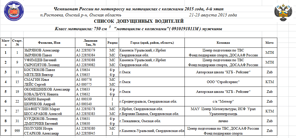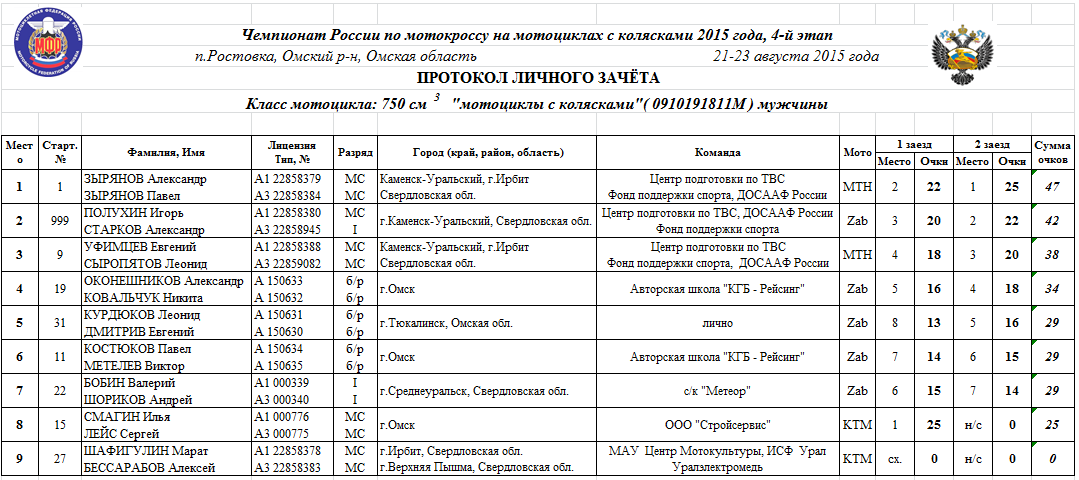"Коляски" Чемпионат России 2015 - Ростовка 23.08.2015 Роман Мишенев Протоколы результатов 4-го этапа Чемпионата России 2015 года по мотокроссу на мотоциклах с колясками, состоявшегося 21-23 августа на трассе п.Ростовка (Омский р-н, Омская область). Комиссия мотокросса на мотоциклах с колясками Комментарии Комментарии к этой статье запрещены.