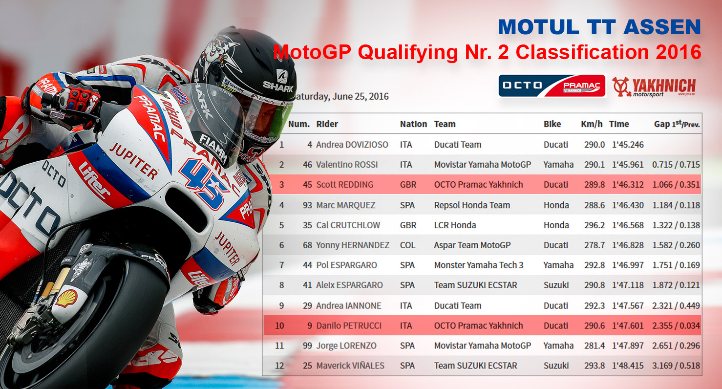 Отличным результатом для российско-итальянской команды OCTO Pramac Yakhnich завершились квалификационные заезды восьмого этапа чемпионата мира по шоссейно-кольцевым гонкам - MotoGP в голландском Ассене.