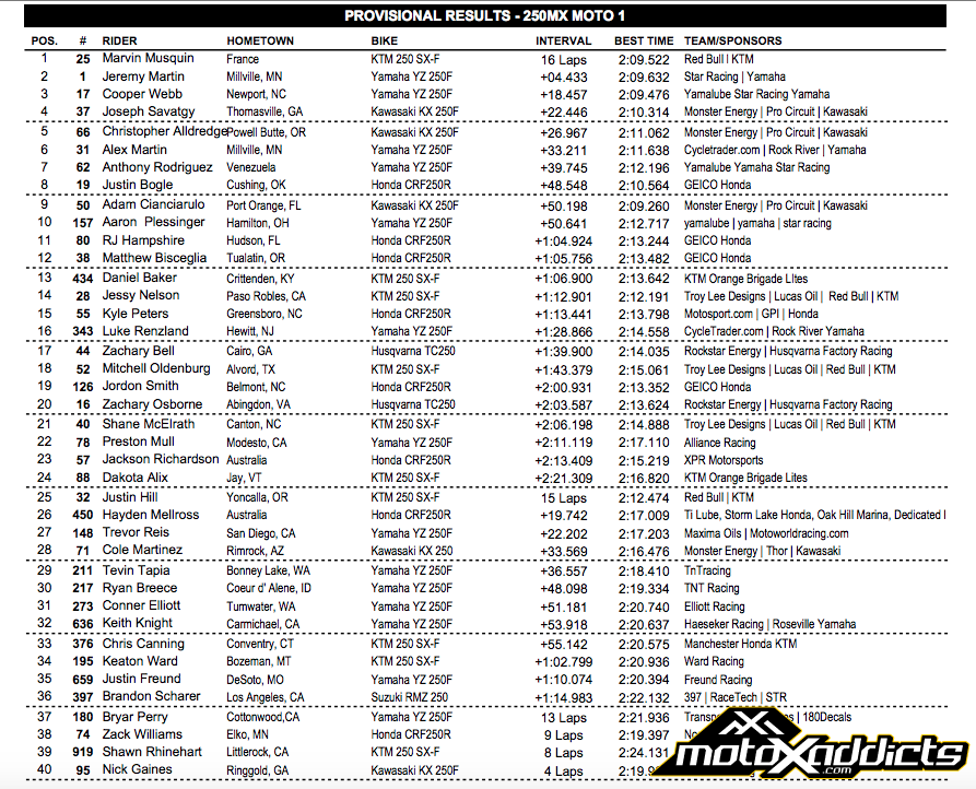 В классе 250 МХ победу в первом заезде одержал Марвин Маскуин, а Элай Томак стал победителем в 450МХ показав невероятную скорость.