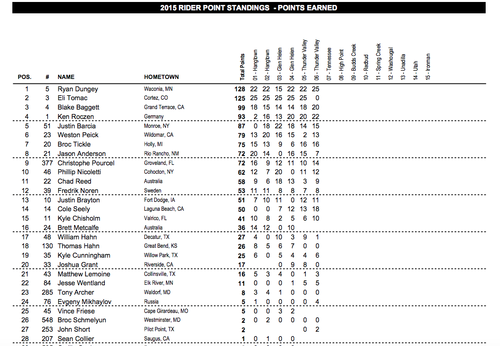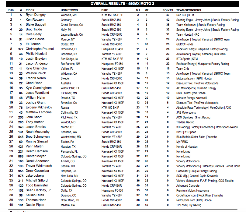 Победителем в классе 450МХ стал Райан Данжи (2 и 1 места в заездах) и теперь он выходит в лидеры общего зачета.