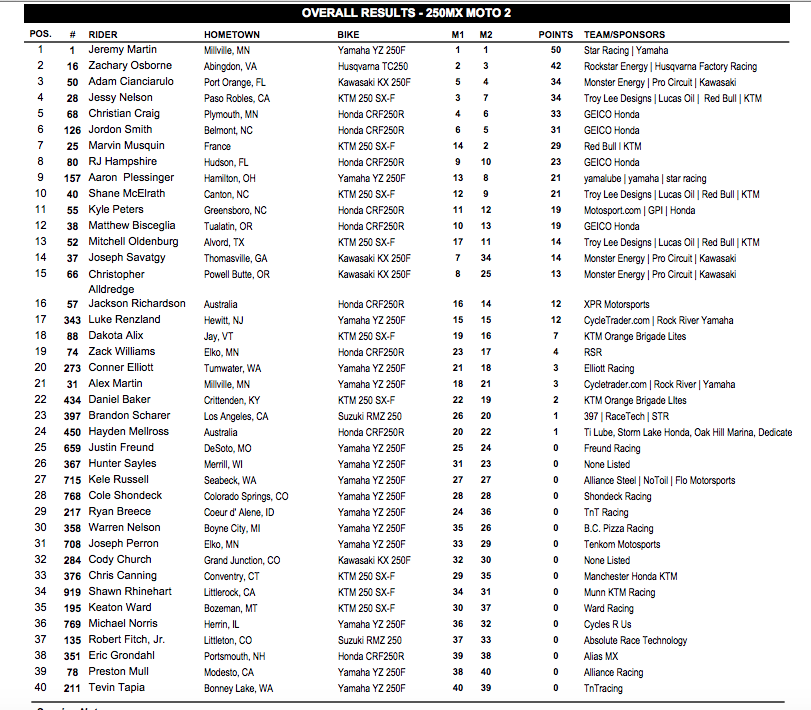 В классе 250МХ выиграв оба заезда - победу одержал Джереми Мартин, теперь он вновь лидер общего зачета. Второе и третье места у Зака Осборна и Адама Сиасиаруло.
