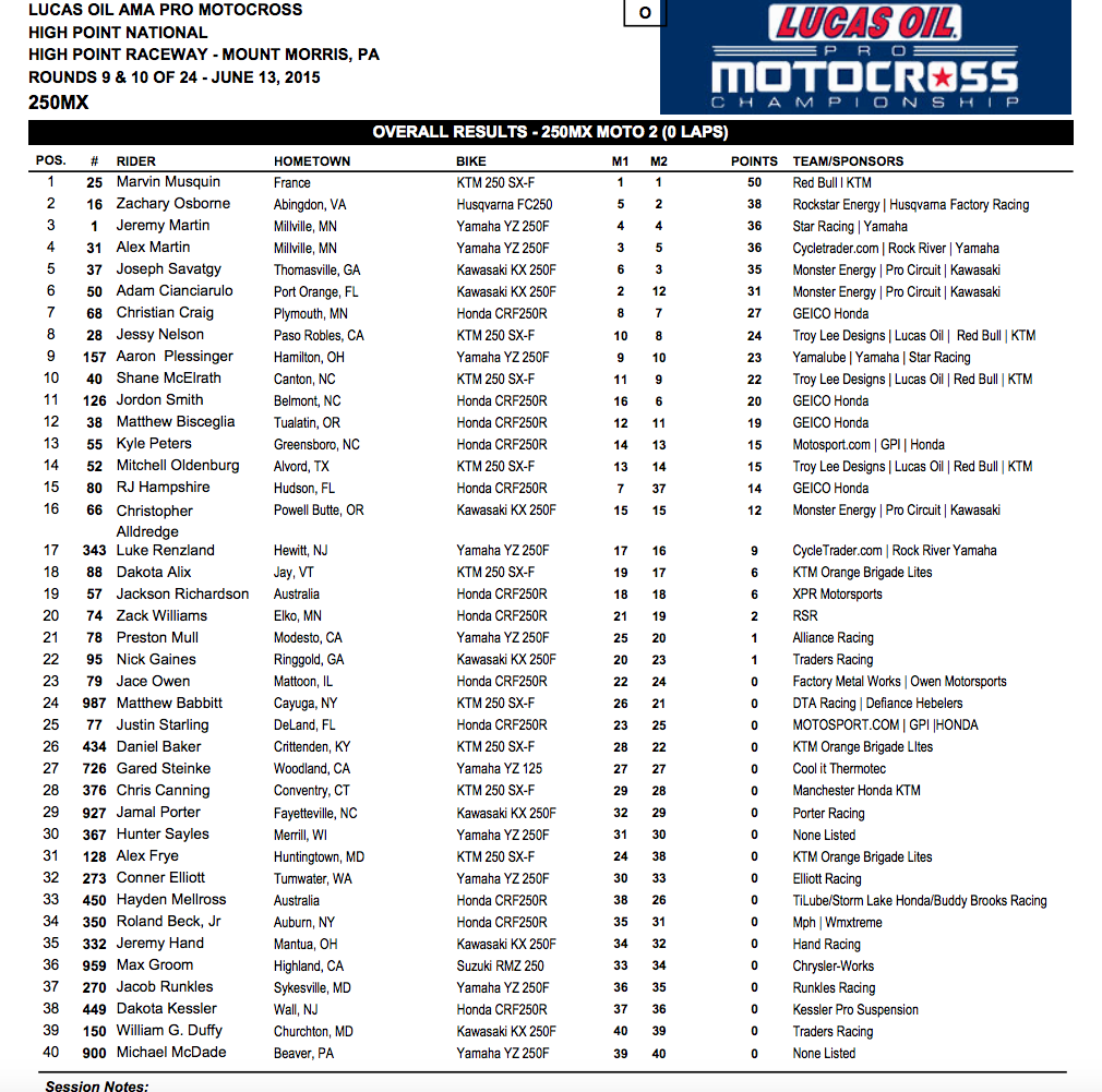 Результаты пятого этапа АМА Мотокросс 2015 в классах 250МХ и 450МХ.
