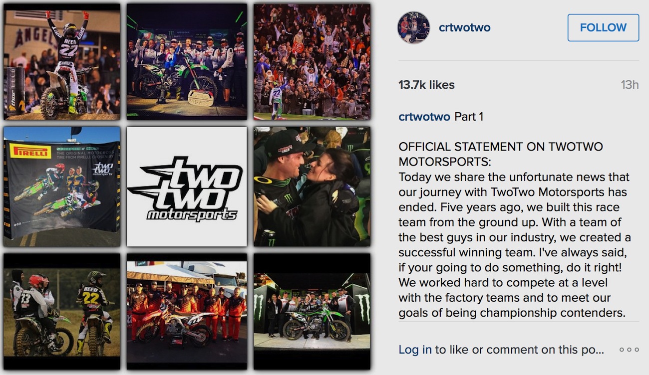 Сегодня Чад Рид сделал официальное заявление на Instagram, что команда TwoTwo Motorsports прекратила свое существование...