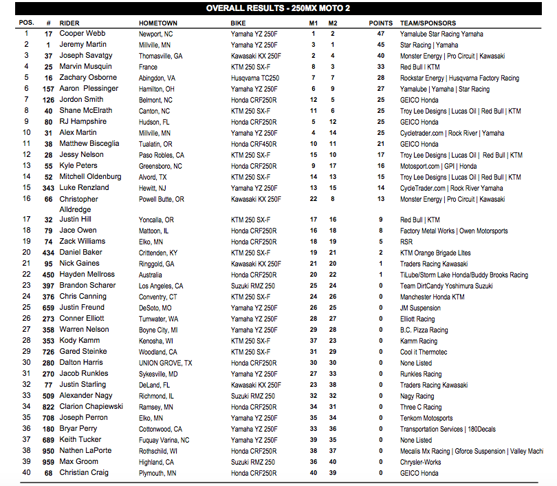 Победу в классе 250МХ одержал Купер Вэбб. Второе и третье места у Джереми Мартина и Джозефа Саватжа.