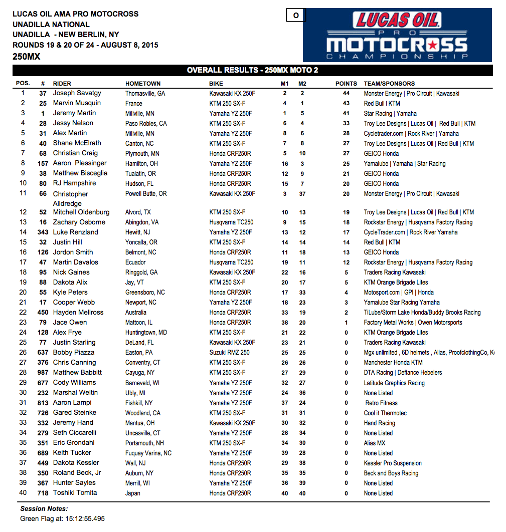 Ну, а победителем этапа в Юнадилла в классе 250МХ стал Джозеф Саватж, который занял два вторых места в заездах.