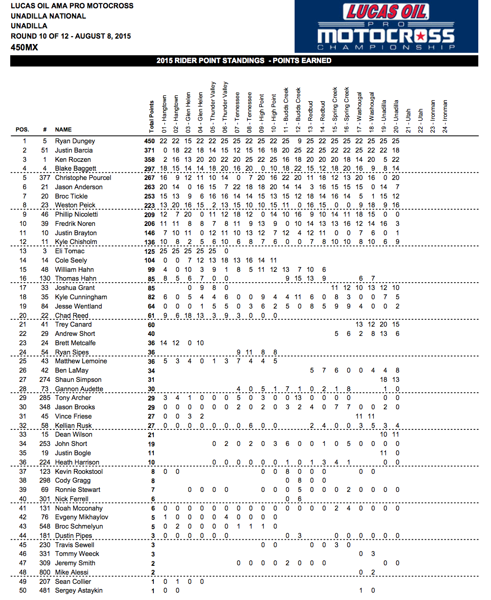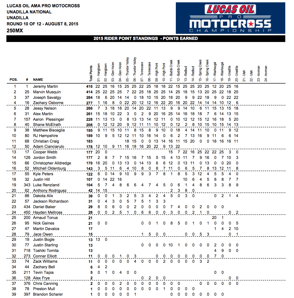 Итоги десятого этапа серии АМА Мотокросс 2015 в классах 250МХ и 450МХ.