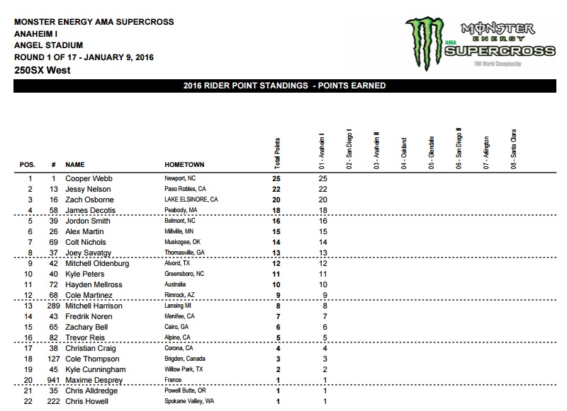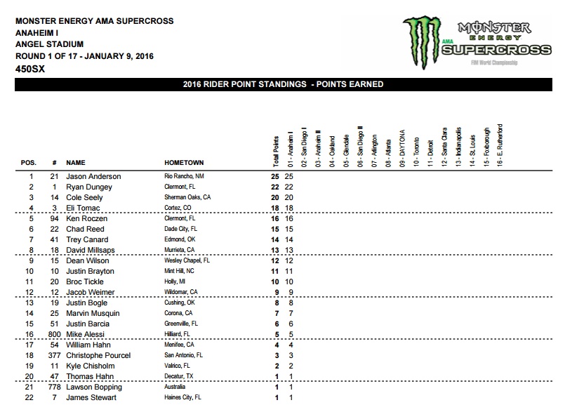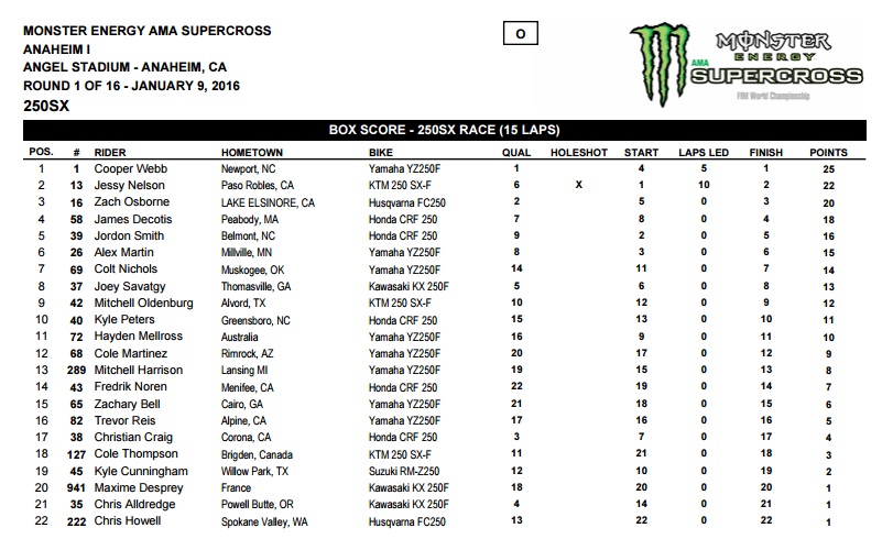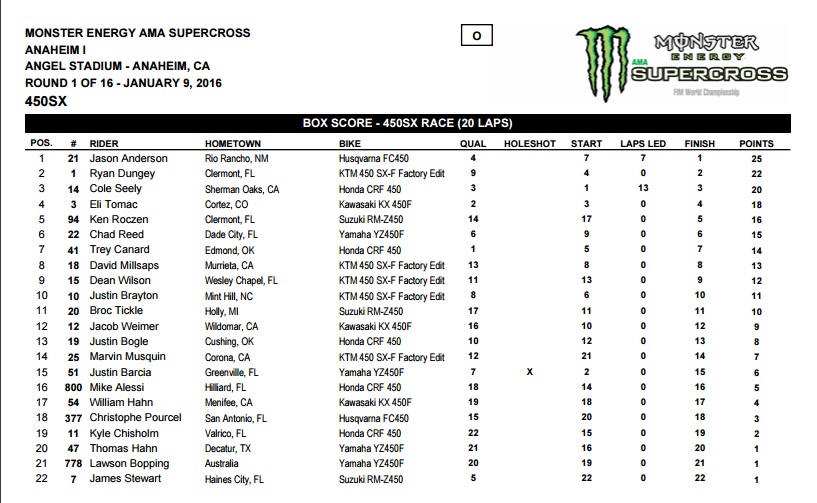 Jason Anderson (Husqvarna) и Cooper Webb (Yamaha) стали призерами первого этапа Суперкросса АМА прошедшего в Анахайме. James Stewart был травмирован и прямо с трека был госпитализирован.