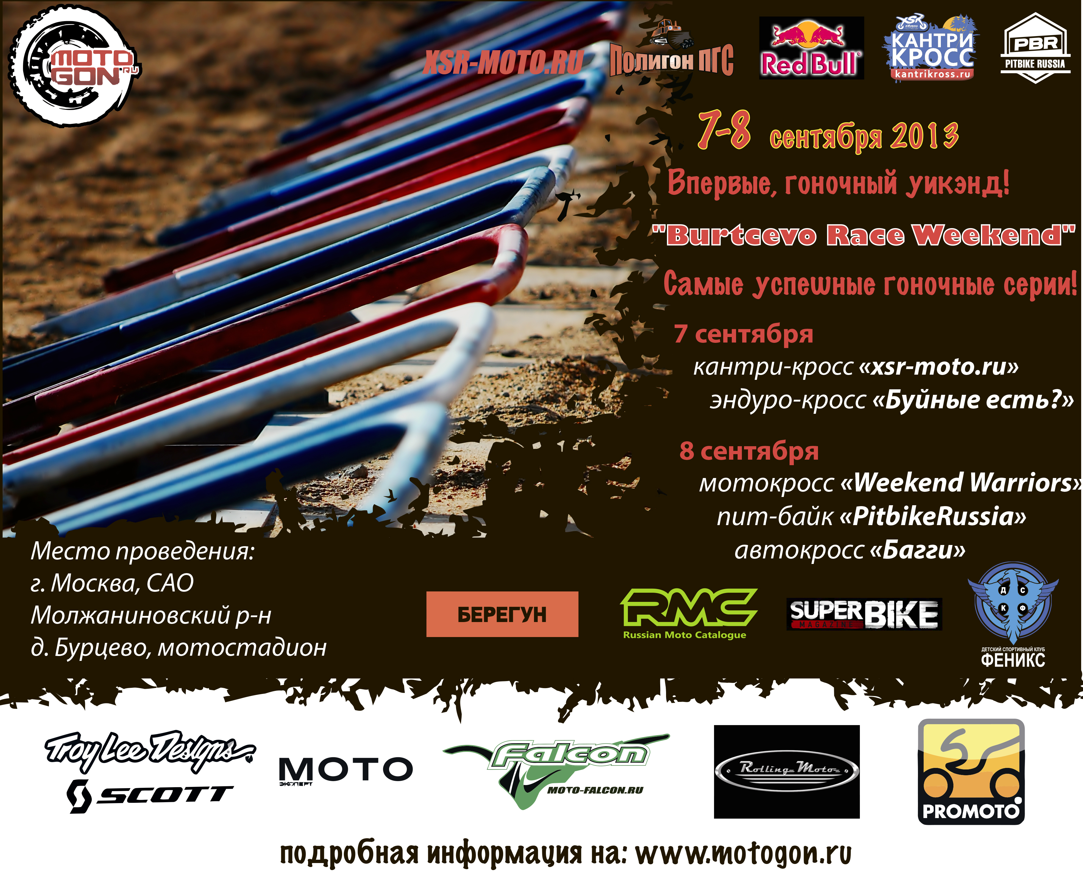 Легендарный "кантри"от XSR Moto и молодой и дерзкий эндуро - кросс "Буйные есть?", гонка культовой серии Weekend Warriors и автокросс "Багги"! А так же впервые на стадионе "Бурцево" заезды на питбайках от PitebikeRussia