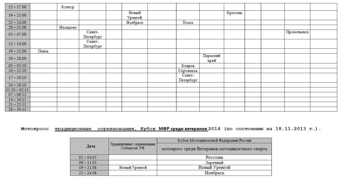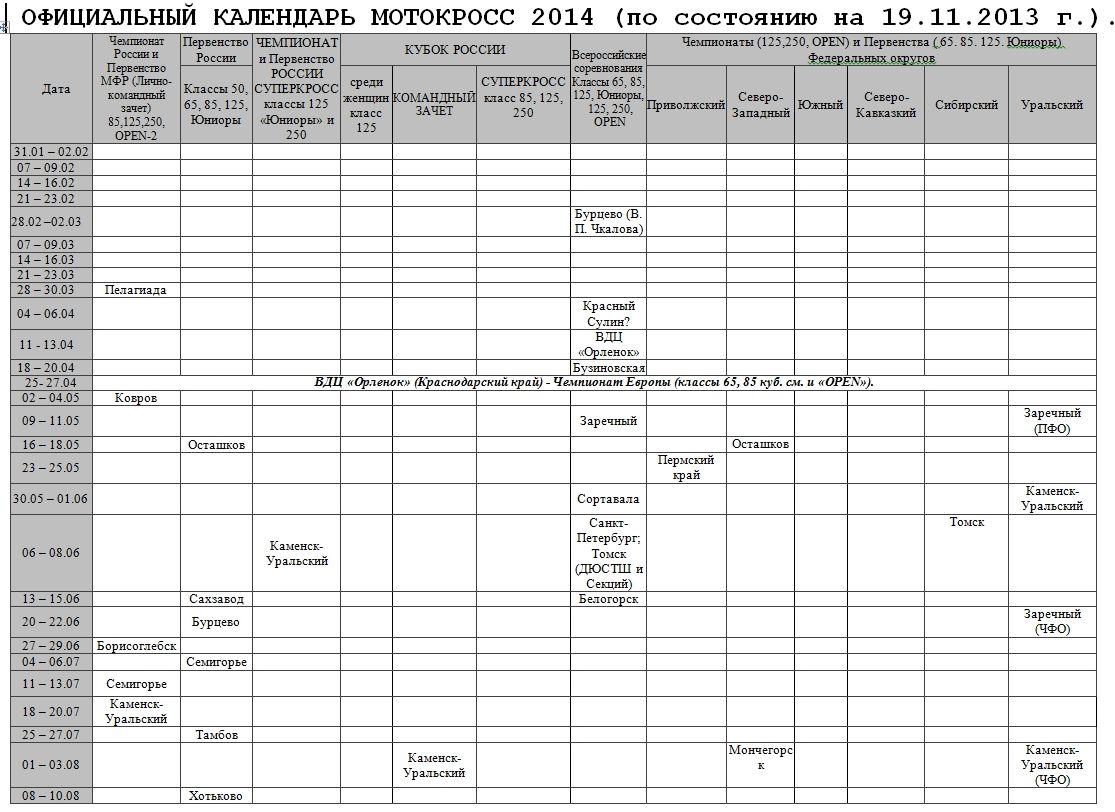 Официальный календарь соревнований МФР на сезон 2014 года 19.11.2013 МФР Официальный календарь российских соревнований по мотокроссу и суперкроссу сезона-2014 по состоянию на 19 ноября... Комментарии Комментарии к этой статье запрещены.