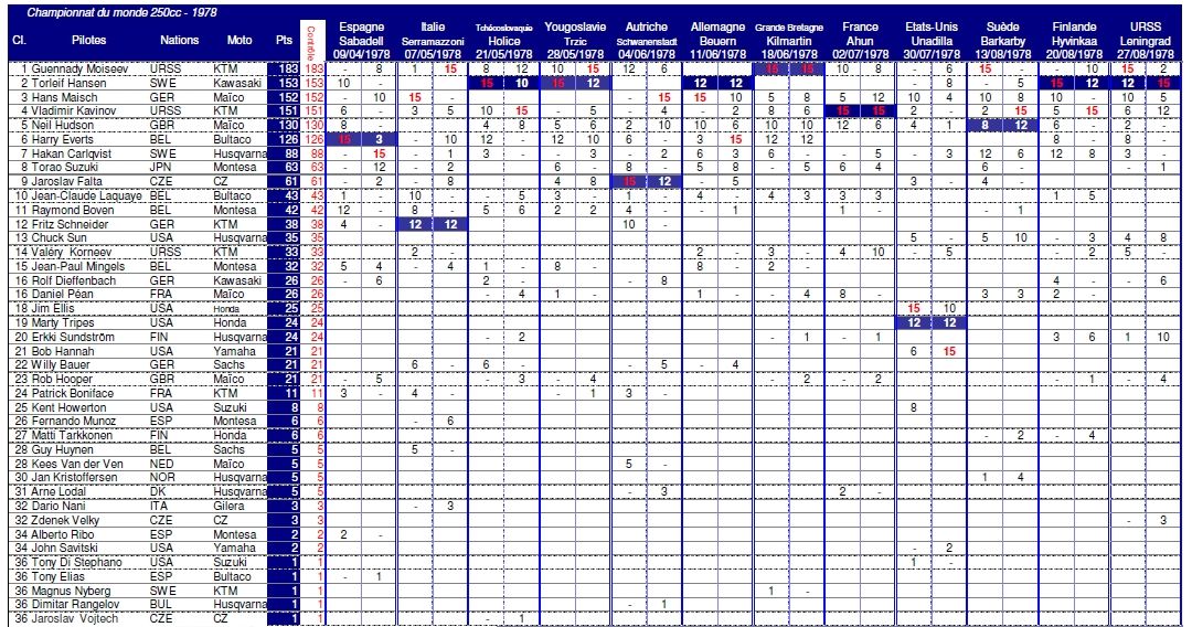 Чемпионат мира 1978 года...  класс 250сс ... Гран-При Германии, которое выиграл швед Торлейф Хансен. Гран-При Шотландии - Килмартин - победа на этапе Геннадия Моисеева.