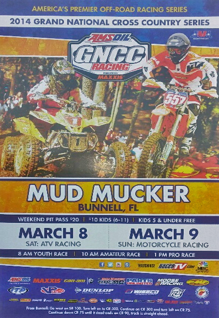 8 и 9 марта в Mud Muckers Bunnell (штат Флорида) пройдет первый этап АМА Кросс-Кантри 2014 (AMSOIL Grand National Cross Country Series). Класс ATV стартует в субботу, а класс Мото с трехчасовым заездом в воскресенье. Внедорожный парк Mud Muckers является частной трассой расположенной на 11000 акрах в северо-центральной части Флориды, примерно в 30 минутах к северу от Daytona.
