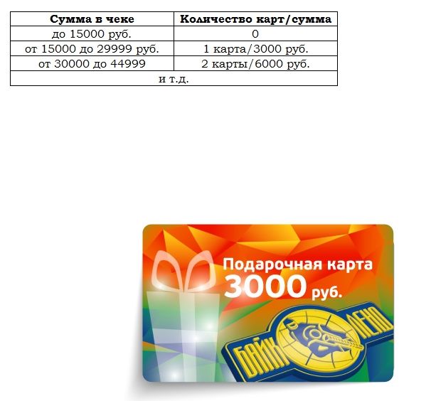 При покупке мотоэкипировки с 1 апреля по 31 июля 2014 года на каждые потраченные 15000 рублей единовременно (в одном чеке), мы вернем Вам 3000 рублей.