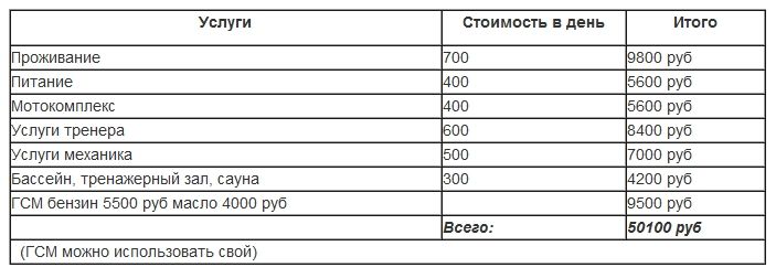 Тренировки на трассе чередуются с тренировками в тренажерном зале, или с плаванием в бассейне. Тренажерный зал и бассейн по 2 раза в неделю. Сауна 1 раз в неделю.