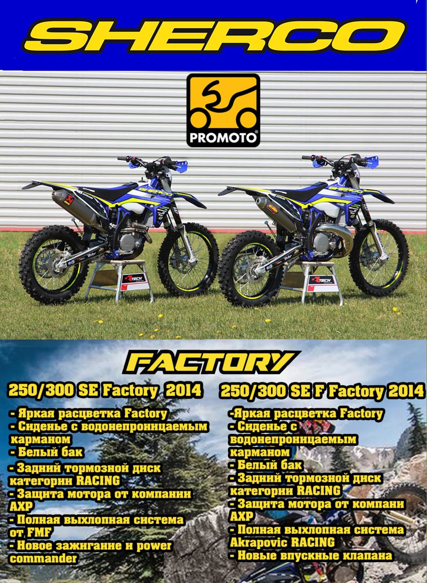 В линейке мотоциклов Sherco появилось 4 новых мотоцикла: Sherco 250/300 SE (2Т) Factory и Sherco 250/300 SE F (4Т) Factory.