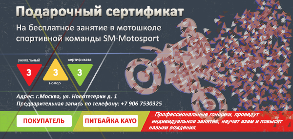 2. При покупке питбайка клиент получает подарочный сертификат на одно бесплатное занятие на своём пите у профессионального инструктора по мотокроссу (площадка Ивана Купченко).
