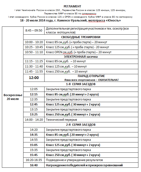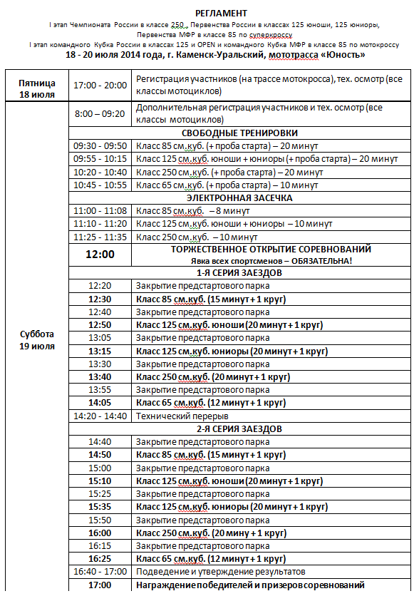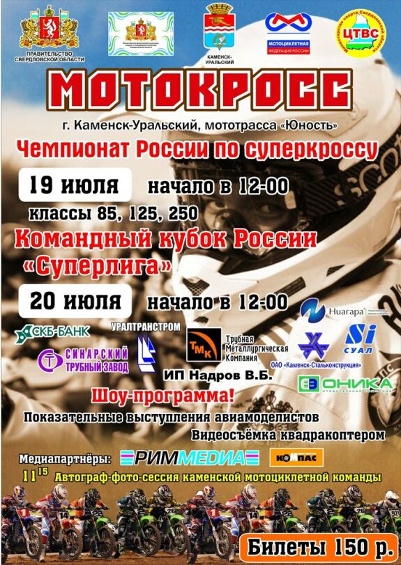 19-20 июля в Каменске-Уральском на специально подготовленной трассе «Юность» состоится первый этап Чемпионата России в классе 250 куб. см, Первенство России в классах 125 куб. см (юноши) и 125 куб. см (юниоры), Первенство МФР в классе 85 куб. см по Суперкроссу.