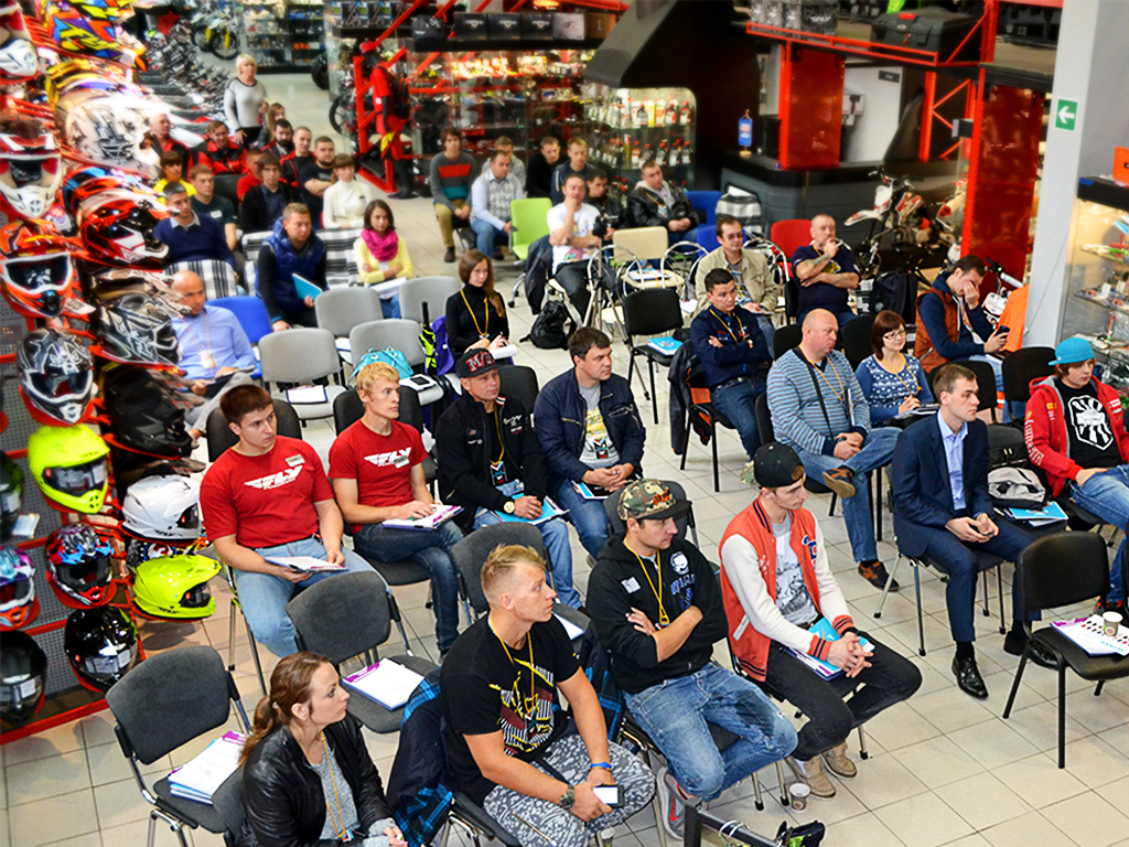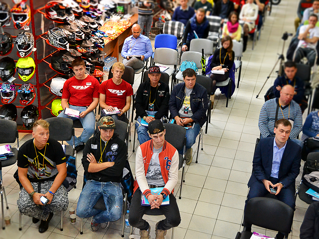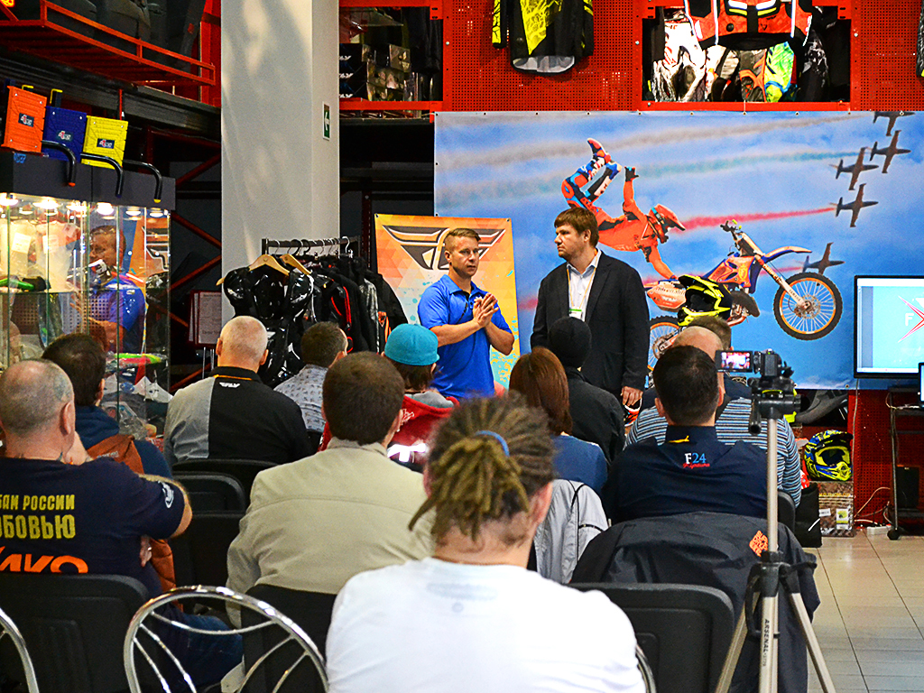 На встрече, где присутствовали приглашенные дилеры и партнеры компании, была проведена презентация коллекции Fly Racing 2015 года – представитель американского производителя мотоэкипировки Джейсон Томас в подробностях и на наглядных примерах рассказал о фирменных «фишках» продукции и особенностях ее продвижения на локальных рынках. Он также поделился планами развития компании, выслушал замечания и предложения, ответил на вопросы присутствующих.