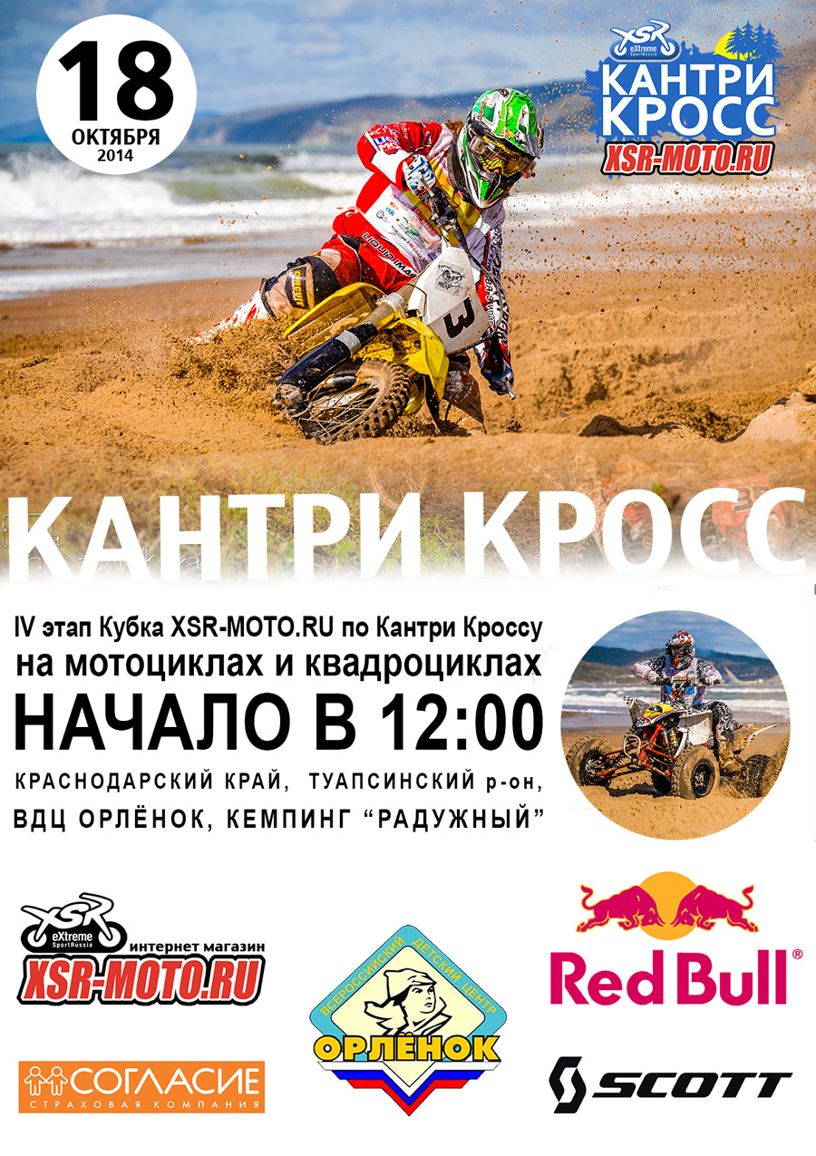 Уважаемые мотоспортсмены, мотолюбители и мотоболельщики!!! Не забудьте посетить 4-й, самый долгожданный, самый непредсказуемый и самый позитивный этап Кубка XSR-MOTO по Кантри-кроссу. Он, как обычно пройдет в ДОЛ Орленок в Туапсинском районе Краснодарского края 18 октября 2014 года!!!! Вас ждут море, солнце, дельфины и хорошее настроение!!!