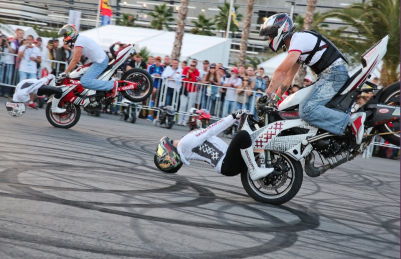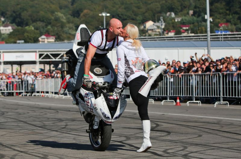 Для выступления в Сочи прорайдеры подготовили специальную программу, включающую комбинацию сложнейших трюков: Stoppie («стоппи» – езда на переднем колесе, один из наиболее опасных элементов станта), Wheelie («вилли» – движение на заднем колесе), Circles («сайкл» – езда на заднем колесе по кругу на повышенных оборотах, стоя или сидя, зачастую без помощи рук). Синхронность, сложность исполненных трюков и артистизм стантрайдеров и их напарниц завоевали сердца многочисленных зрителей на Формуле-1 в Сочи!