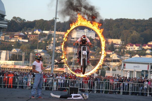 Кульминационным элементом программы стал крайне опасный финт, вызвавший взрыв оваций на трибунах: прыжок через огненное кольцо. Поднявшись в воздух на полтора метра, мотоцикл «перепрыгнул» двух лежащих на асфальте девушек, преодолев огненное препятствие диаметром 2,5 метра. При этом общая длина прыжка достигла восьми метров!