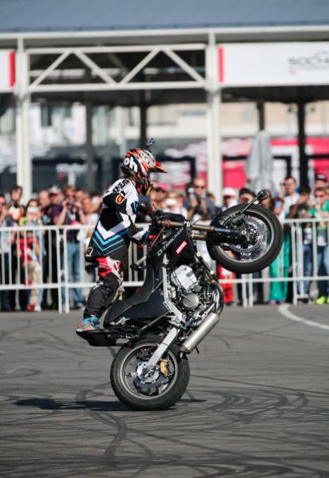 Акробатические трюки на мотоциклах демонстрировали самые опытные и эмоциональные райдеры сильнейшей в Еропе команды Stuntfighters в составе семейных дуэтов – Яниса и Сандры Розитис, Лауиса и Сабины Клебахс. К слову, Янис Розитис, являющийся основателем стантрайдинга в Латвии, выступает с 2005 года и завоевал множество титулов на чемпионатах Восточной Европы (Motul M1-Stunt Buttle), Прибалтики и СНГ.