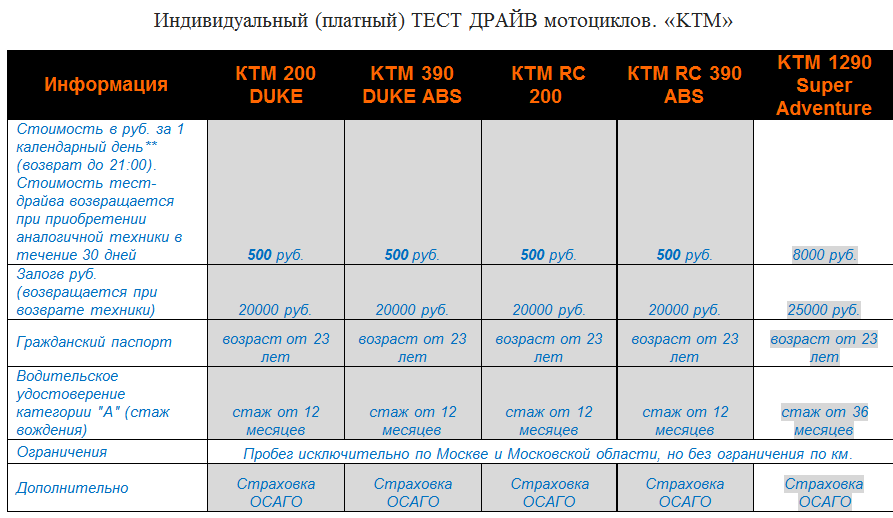 ** Продолжительность тест-драйва для мотоциклов серии DUKE и RC – 3 часа!