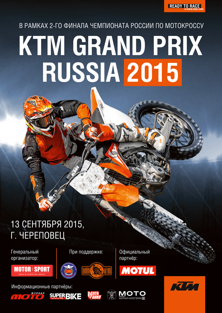 KTMGRAND – PRIXRUSSIA 2015 состоится в рамках 2 – го финала Чемпионата России по мотокроссу в г. Череповец, а это значит, что на старте мы увидим не только сильнейших спортсменов, но и тех, кто по итогам зональных соревнований не сумел пробиться в финал, но готов вновь выйти на старт и побороться за победу c самыми быстрыми гонщиками страны!