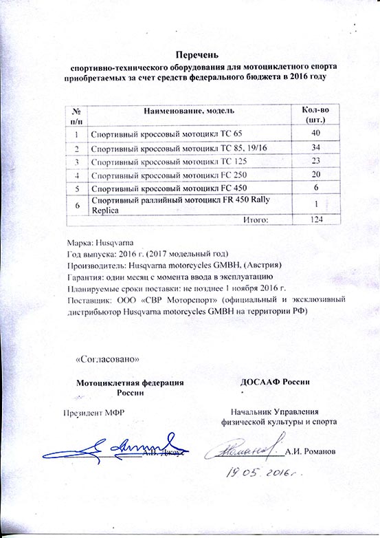 19 мая Мотоциклетная Федерация России согласовала с ДОСААФ России закупку спортивных мотоциклов приобретаемых за счёт средств федерального бюджета 2016 года.