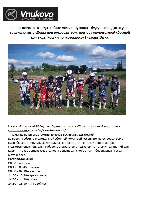 Сборы на базе АМК "ВНУКОВО" с 4 по 16 июля 2016 года, идет запись! 15.06.2016 Андрей Коваль Сборы проводятся под руководством Юрия Глухова. Комментарии Комментарии к этой статье запрещены.