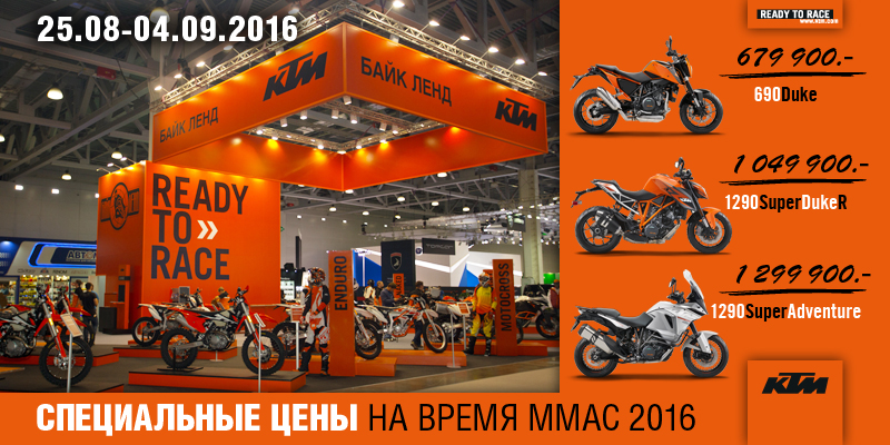 Только во время проведения Московского Международного Автомобильного Салона Вы можете приобрести мотоциклы KTM 2016 модельного года по специальным ценам!