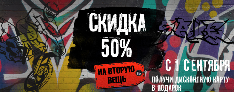 В период с 1 по 30 сентября 2016 года в наших мотосалонах действует Акция «Скидка 50% на вторую вешь»: при покупке двух единиц мотоэкипировки предоставляется скидка в размере 50% на вторую вещь в чеке, меньшую по стоимости.