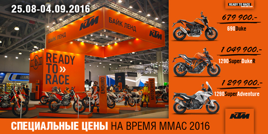 Только во время проведения Московского Международного Автомобильного Салона Вы можете приобрести мотоциклы KTM 2016 модельного года по специальным ценам: