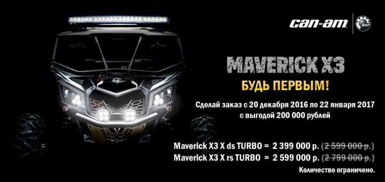 Компания FORMULA 7 запускает акцию «Будь первым!», которая продлится с 20 декабря по 22 января. При условии стопроцентной предоплаты в рамках специального предложения скидка на ряд моделей Maverick X3 составит 200 000 рублей. Поставку техники по акции мы гарантируем уже из первой партии: не позднее 20 февраля. Количество мотовездеходов ограничено, дистрибьютор оставляет за собой право завершить акцию раньше окончания срока.