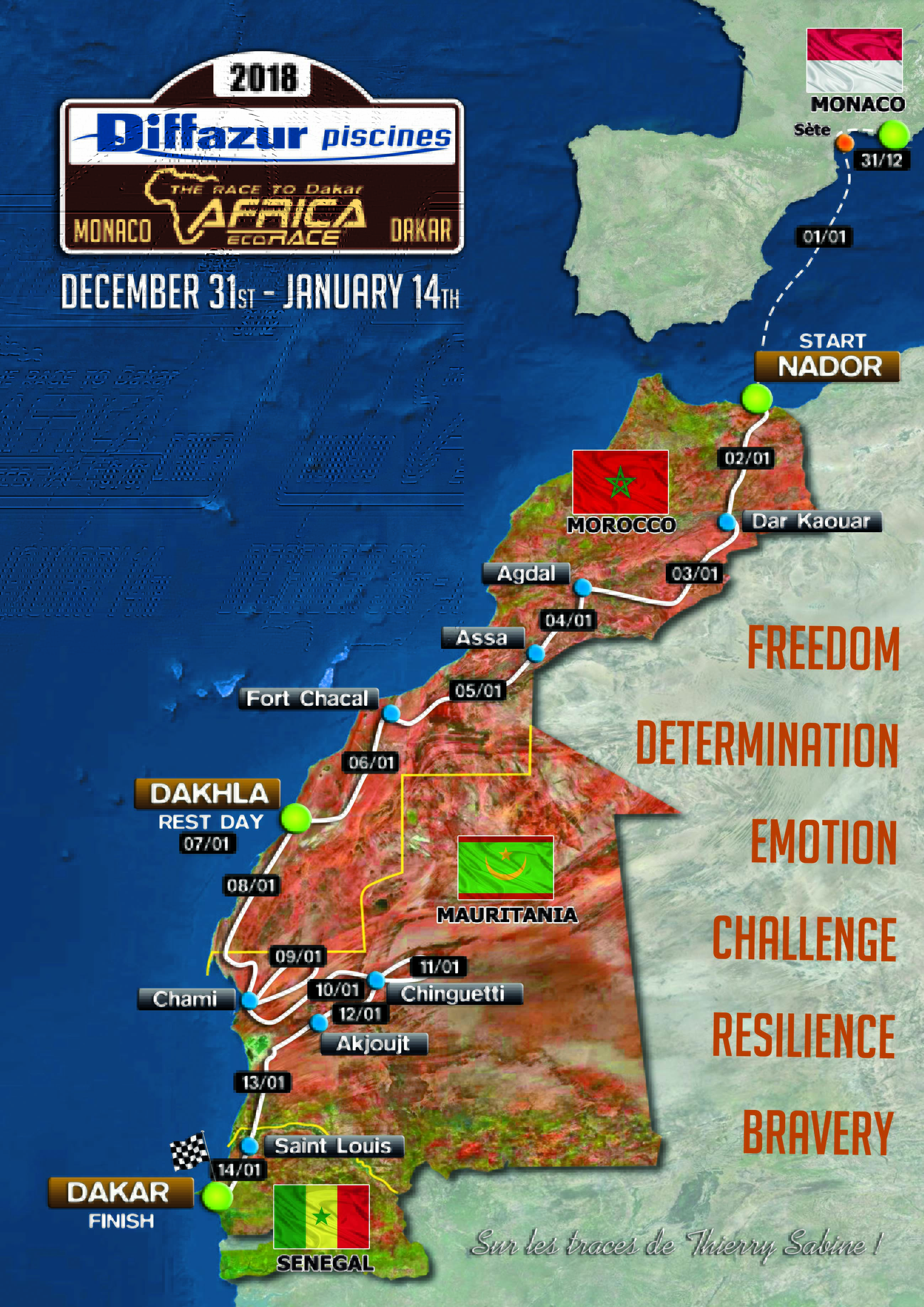 В Марокко, несмотря на то, что очень сложно из года в год делать какие-то фундаментальные изменения в маршруте пока караван пересекает страну с севера на юг в течение 5 дней, все-таки найдены некоторые свежие решения на первых трех этапах. Участники доберутся до Эль-Айюн (Laayuone) на четвертом этапе, что позволит сделать пятый этап абсолютно новым! Спортивный директор гонки и его команда действительно максимально проработали юг Марокко, чтобы выбрать лучшие треки, где в свои лучшие годы проходил великий марафон из Парижа в Дакар!