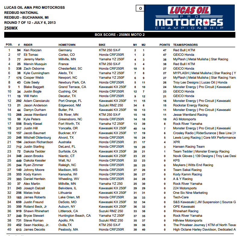 Вчера, на треке Рэд Бад (REDBUD– штат Мичиган), отмечающей в этом году 40-летний юбилей, прошел седьмой этап Чемпионата Америки по мотокроссу 2013 (Lucas Oil Pro Motocross Championship series).