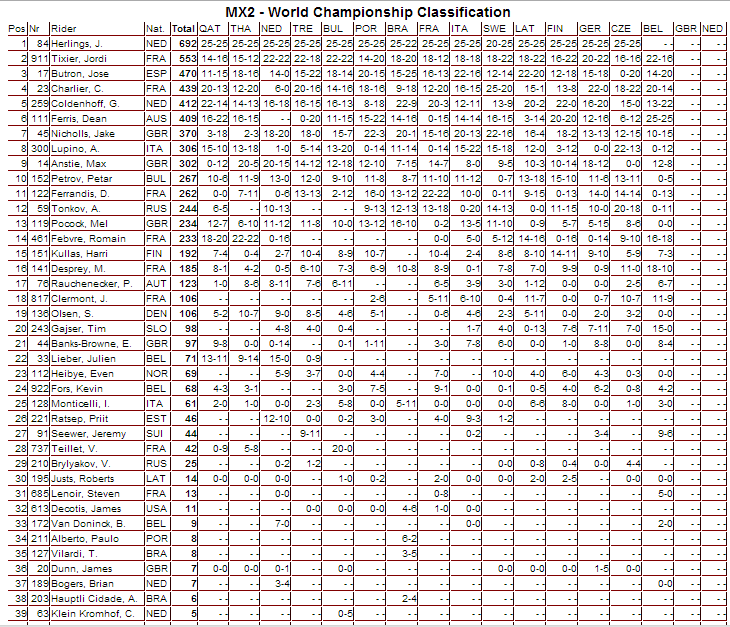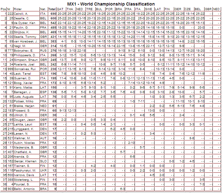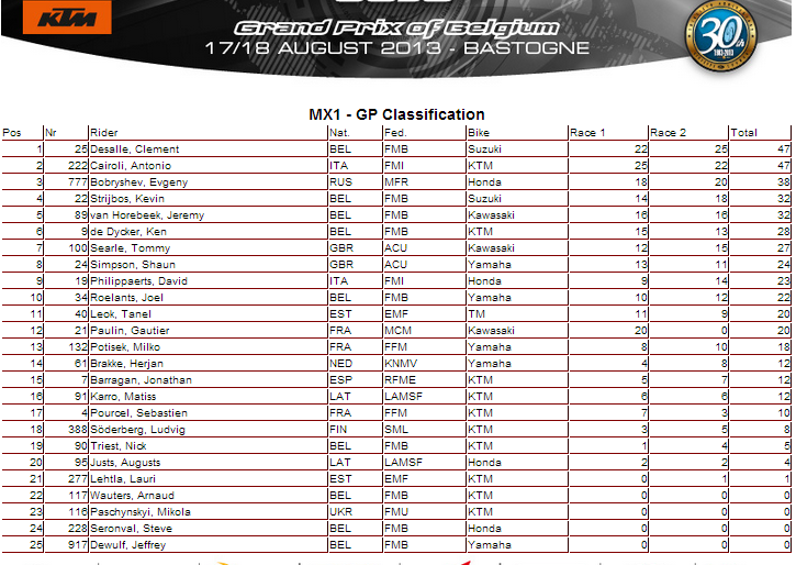 В общем зачете Антонио Кайроли опережает Клемента Десалля на все те же 90 очков, поэтому празднование по поводу чемпионского звания переносится на следующий этап. После бельгийского этапа Евгений Бобрышев переместился на девятую строчку в общем зачете