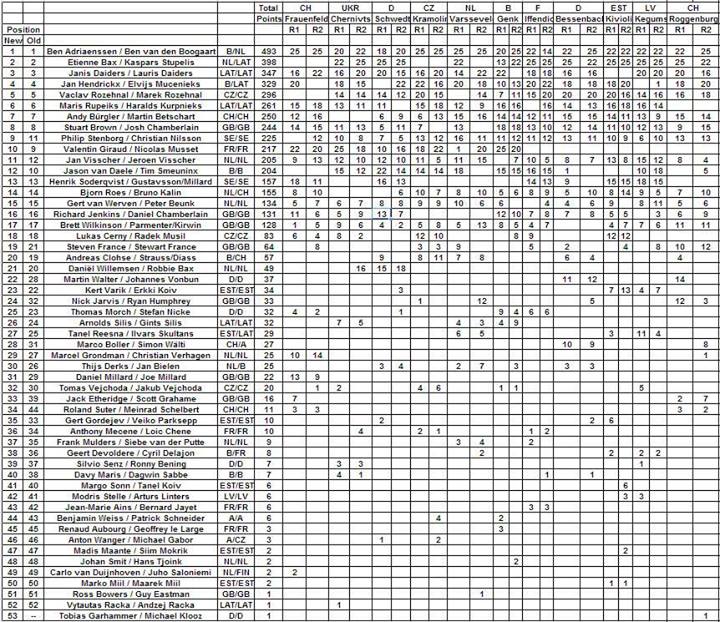 В общем зачете, с существующим разрывом в 95 очков нынешние лидеры Адриенссен - Боогарт могут стать чемпионами мира уже через 3 недели в Dardon-Geugnon во Франции 8 сентября. При условии, если они по крайней мере, заработают на 6 очков больше, чем Этьен Бах- Каспарс Ступелис, что даст им непревзойденные 101 очко и титул.