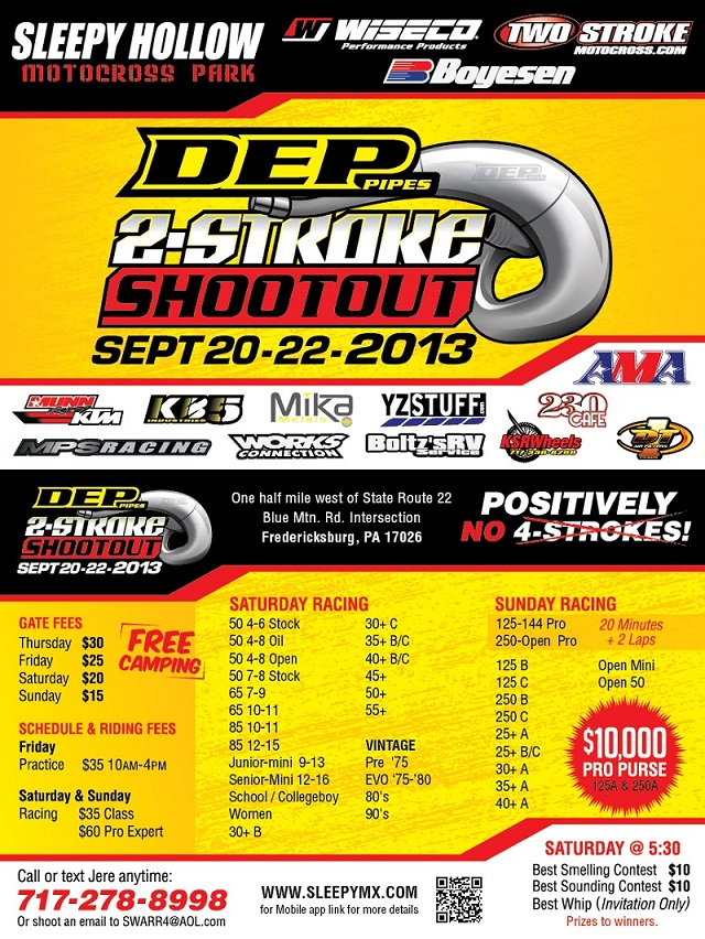 20-22 сентября на треке в Sleepy Hollow (штат Пенсильвания) прошла ежегодная гонка на "двухтактниках" в 38(!) классах мотоциклов. Абсолютным победителем в двух классах мотоциклов 125 и 250 PRO - стал Джимми Дэкотис (на фото внизу).