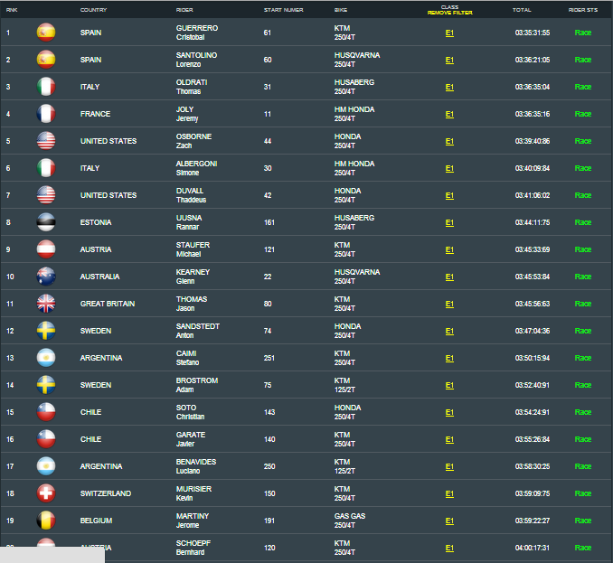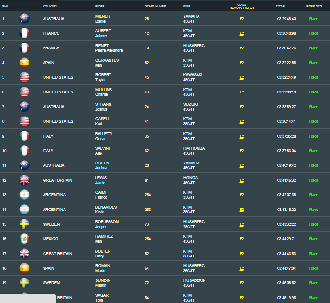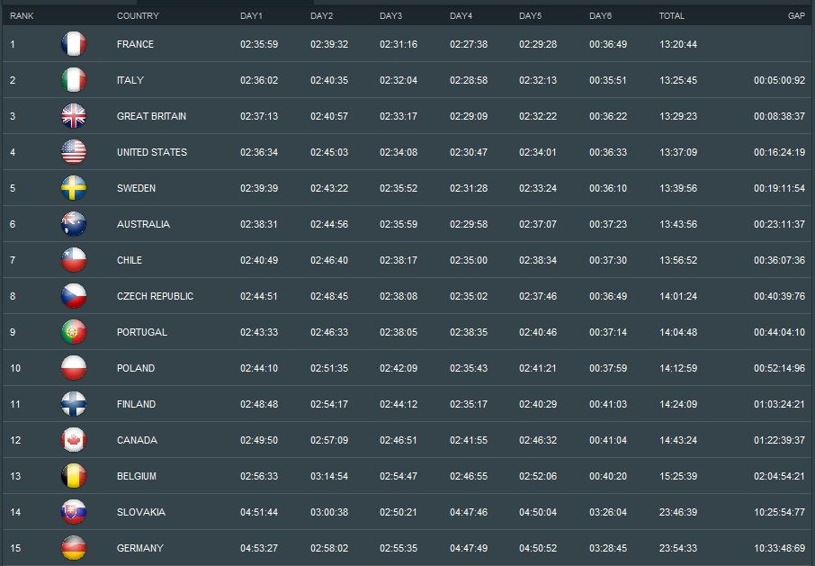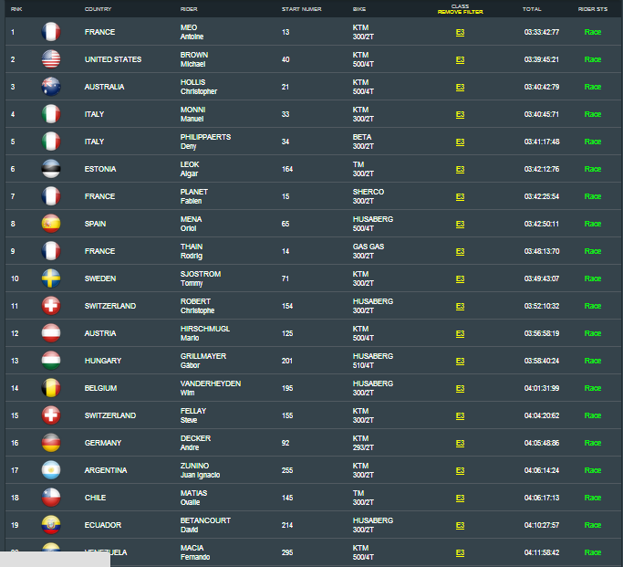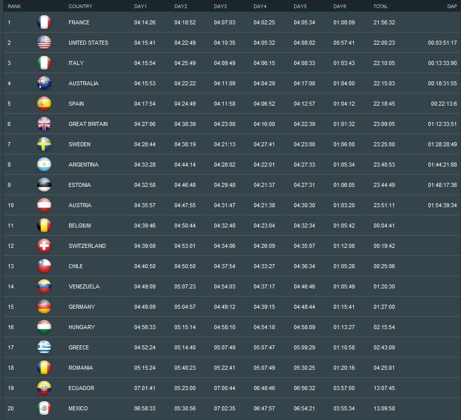 Французы доминировали с самого первого дня гонки, их лучший гонщик Антуан Мео, хоть и не блистал в последний день соревнований, но все равно финишировал на первом месте в общем зачете класса E3. Его товарищи по команде также показали хорошие результаты, Пьер Александр Рене и Джонни Обер на 2-й и 3-й позициях в итоговой турнирной таблице класса Е2, а Джереми Джоли, на 2-ом месте в классе E1.