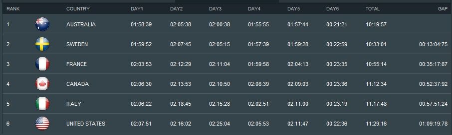 В зачете женщин, первое место у сборной Австралии с их лидером Джессикой Гардинер. Вторая и третья ступеньки пьедестала почета за командами Швеции и Франции.