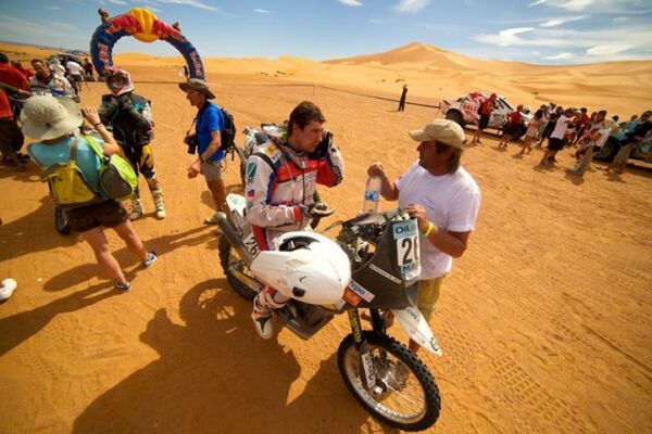Алексей Наумов: "Спец участок в 310 км оказался самым протяженным на этой гонке. С мотоциклом пришлось повозиться, устанавливали настройки, чистили инжектор, меняли помпы, он даже поехал теперь быстрее. Этап для меня был очень пыльный, так как стартовал самый последним. Трасса была очень опасной, с огромным количеством камней и узких дорог. Все эти 300 км пришлось ехать спокойно, в пыли и не рисковать. Но зато я видел настоящего африканского жирафа! Финишировал, правда, только тридцатым. Конечно же на ралли лучше быть в первых рядах - и темп выше, и пыли меньше! "