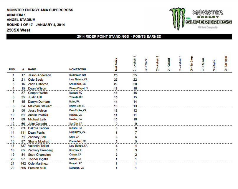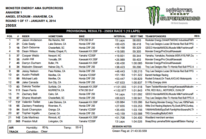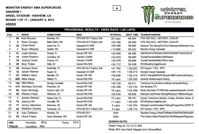 Ну, а победителем первого этапа в Анахайме и своей дебютной гонке в классе 450сс стал Кен Роксен. Второе место занял Райан Данжи, а третьим стал Чад Рид. Четвертое и пятое места заняли Райан Виллопото и Джастин Баршиа.