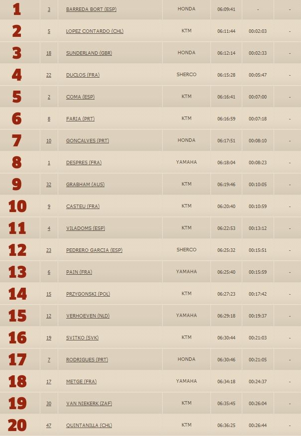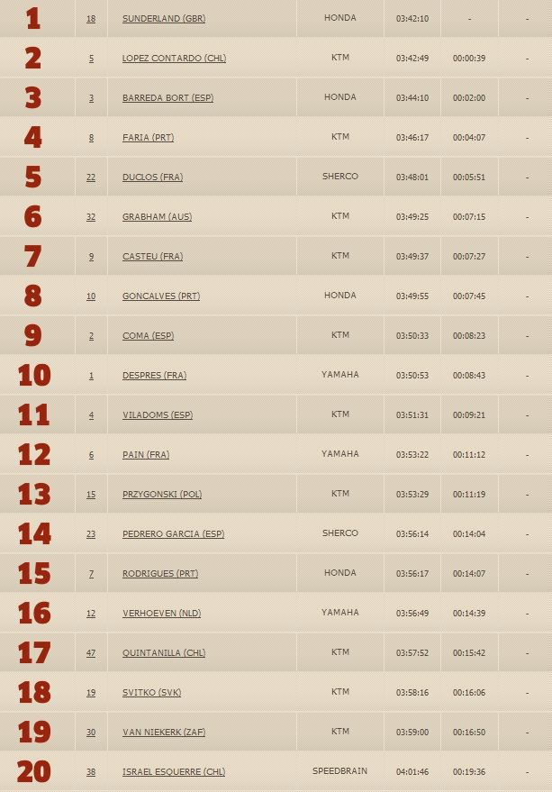 Вторым  приехал Лопез Контардо на КТМ, отстав от лидера всего на 39 секунд.