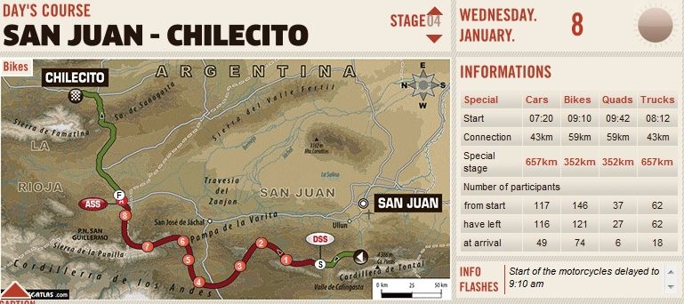Тем не менее, по итогам четырех дней Honda сохраняет за собой первую позицию в ралли-марафоне Дакар: Хуан Барреда Борт, оказавшийся на финише шестым, сохранил лидерство в общем зачете. Заводской пилот KTM - Марк Кома сократил отставание от Honda до 3 минут 10 секунд. Первую тройку замыкает Франциско Лопес Контардо, который в этом году входит в число гонщиков, официально поддерживаемых заводом KTM.