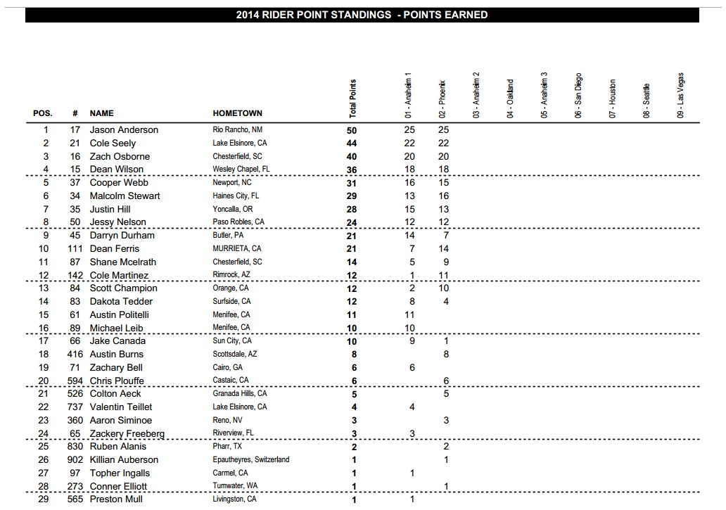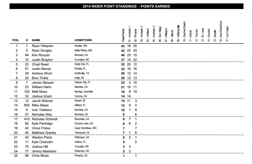 Четвертое и пятое места заняли Джеймс Стюарт и Джастин Баршиа. А вот победитель первого этапа в Анахайме – Кен Рокзен закончил финальный заезд лишь на шестом месте.