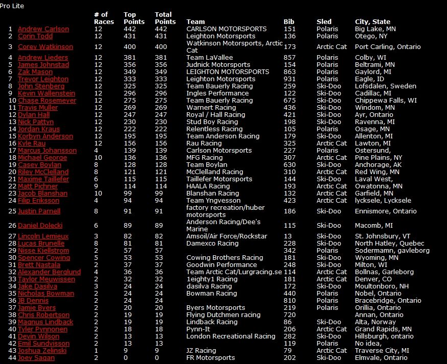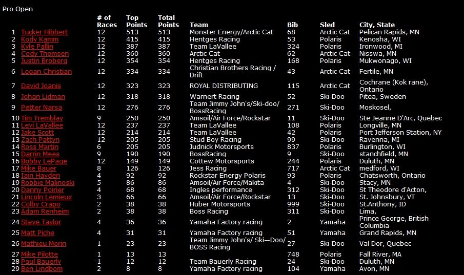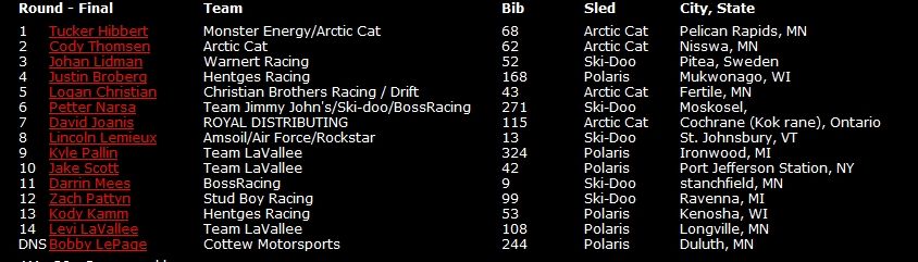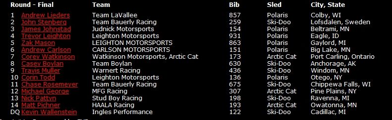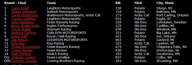 В общем зачете продолжает лидировать Эндрю Карлсон, выступающий за команду Поларис. На второй позиции Корин Тодд, на третьей Кори Уотткинсон на Арктик Кэт.
