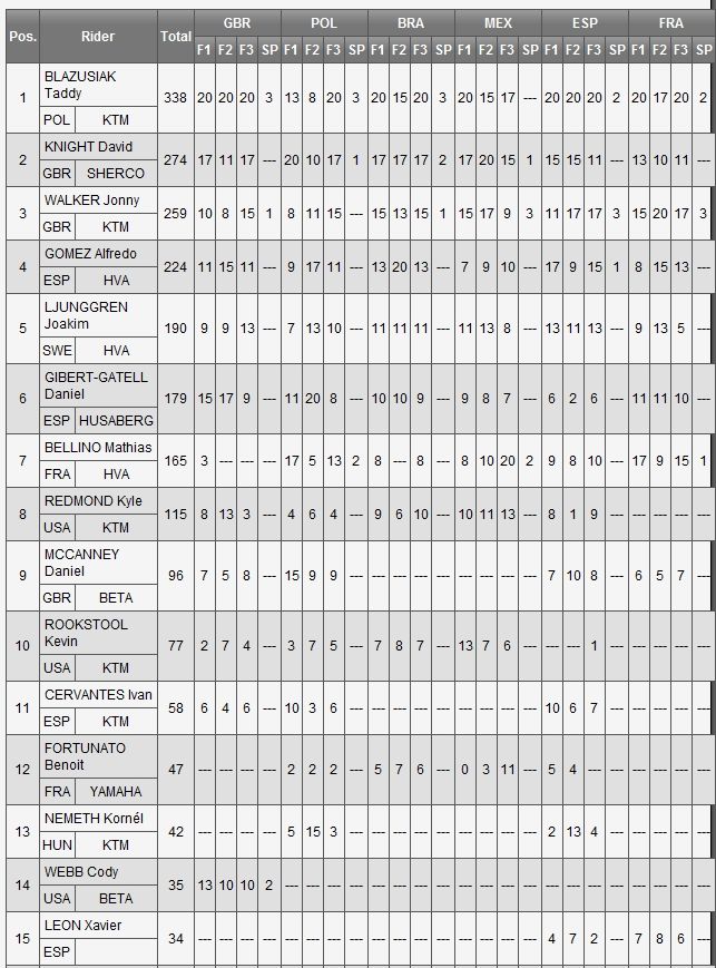 Ну, а в общем зачете серии, первое место и пятый титул у Тэдди Блазусиака, серебро у гонщика команды Шерко - Дэвида Найта, а бронза досталась еще одному представителю заводской КТМ - Джонни Уолкнеру.