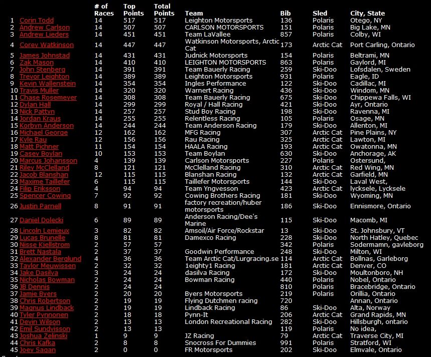 В общем зачете продолжает лидировать Корин Тодд. Эндрю Карлсон переместился на вторую позицию с отставанием всего в 10 очков. Судьба титула в младшем классе решится на заключительном этапе в Grand Geneva.