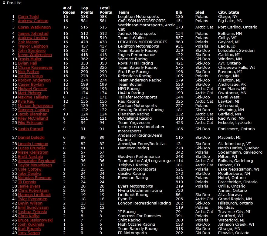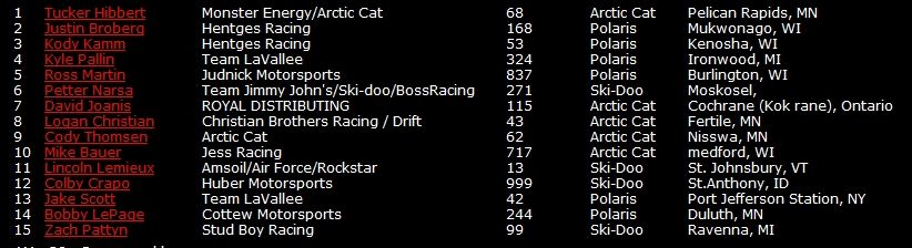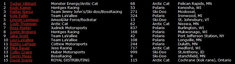 Серебряным призером чемпионата стал Эндрю Карлсон на Polaris, а бронза досталась Кори Уоткинсону на Arctic Cat.